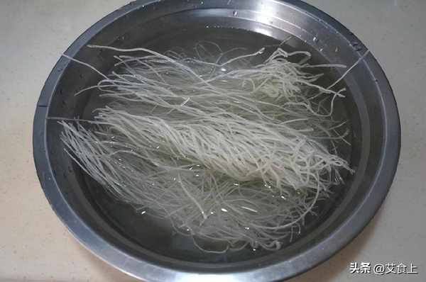 8.加少许盐、足够量的热水,将泡软的细粉条入锅中;