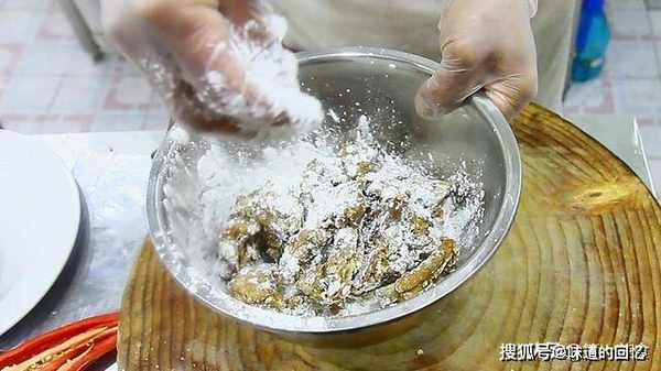 锅里烧油,在等待油热的时间,我们把排骨上撒满干淀粉拌匀。