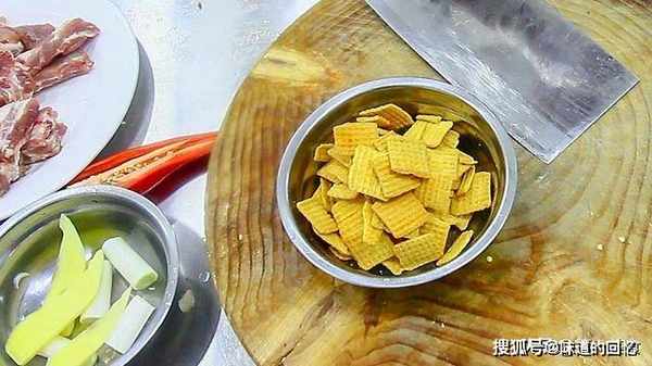 大葱白切成长段,生姜切成片,青椒一个,去籽后切成颗粒,红椒半个,和青椒一样,都切成颗粒,锅巴半袋,倒入盆中。