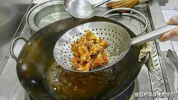 油烧五成热的时候,一个一个的下入排骨,开小火慢慢炸,把排骨炸至金黄色后捞出控油。