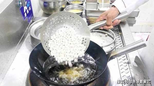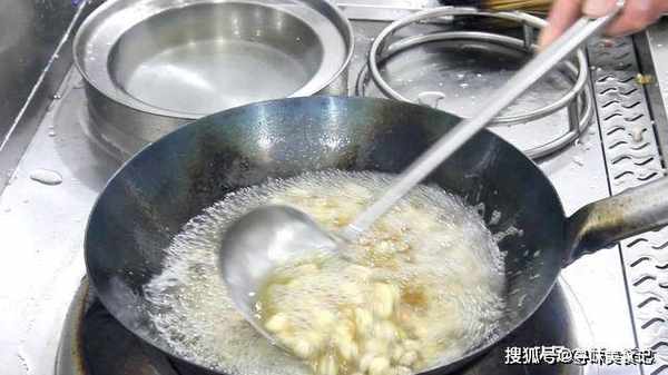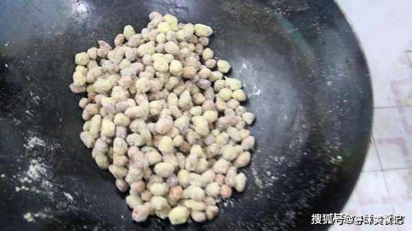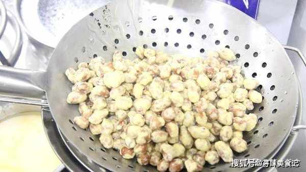 下面,我们把花生米炸一下,锅内倒油,把油烧至4成热,把花生用漏勺 漏去多余的淀粉