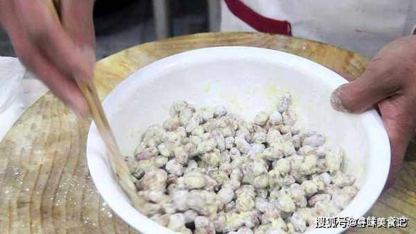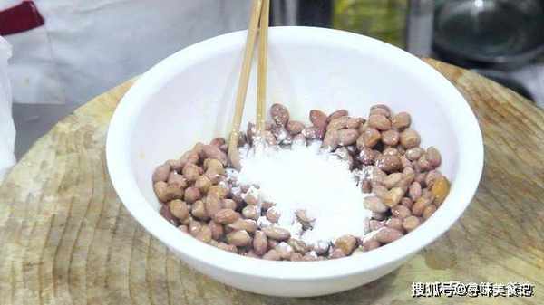 再打入一个鸡蛋,颠盆拌匀拌匀以后,加入一些玉米淀粉淀粉一定要能包裹住花生,并且花生不粘连为好。