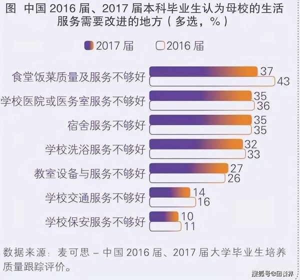 《2018年中国大学生就业报告》显示,2017届本科毕业生认为母校的生活服务需要改进的地方是“食堂饭菜质量及服务不够好”(37%),在各项生活服务中列第一位。