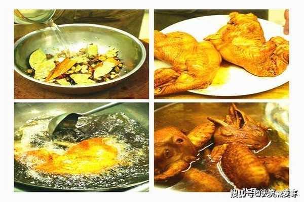 鸡子晾干水汽以后五成油温下锅炸一下,最好用锅盖挡住以免烫伤,炸这一步一是上色、二是收紧鸡皮,这样卤出来皮酥香、肉鲜嫩。经常往露出油面的地方浇油让它均匀受热,不用炸太很、表皮炸酥炸成金黄色就管捞出来了。
