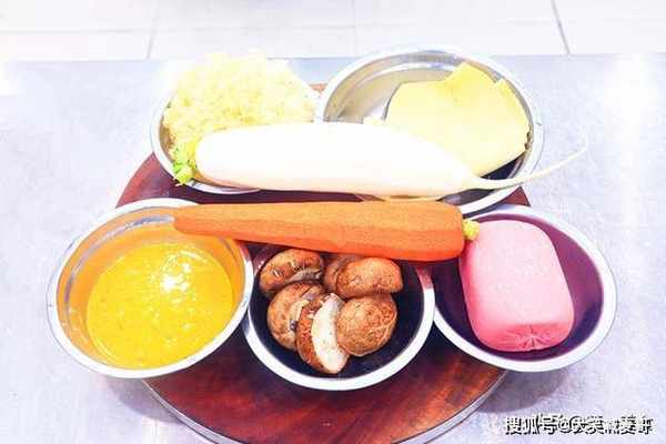 锅内烧水,大火烧开以后放入胡萝卜、白萝卜快速烫10秒钟后捞出来,用清水冲洗降温保持清脆的口感。接着把豆腐皮、香菇也都汆煮一下、倒出来控水。