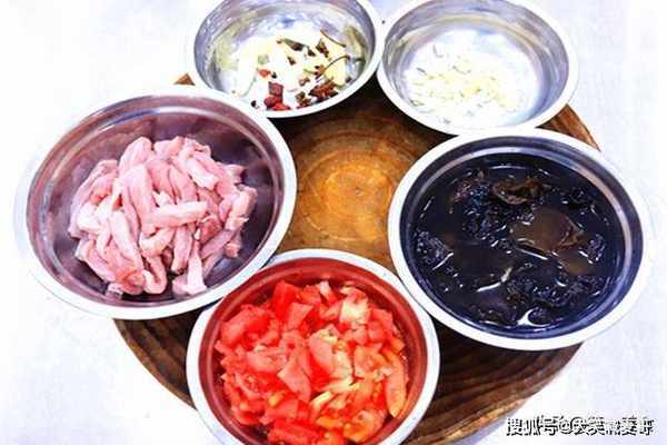 首先,我们准备一里脊肉,先切成厚片,再切成粗条放入盆中,加入食盐、胡椒粉、料酒去腥,抓拌均匀把料汁打进肉条里;然后加入少许清水继续搅拌,水分吸收完以后再次加入清水,肉条吸收水分以后口感更加滑嫩;再打入一个鸡蛋,淋一点老抽上色把颜色搅匀,放入适量的淀粉和面粉锁住水分,最后淋一点植物油,防止下锅的时候粘连。配菜我们用到了木耳,用温水泡发;番茄打上十字花刀用开水烫一下,把外皮剥掉,切成番茄丁;生姜切片,大葱切葱花;另外切一点姜片和葱片放入盆中,抓入一小撮花椒,一粒八角,几粒干辣椒备用。