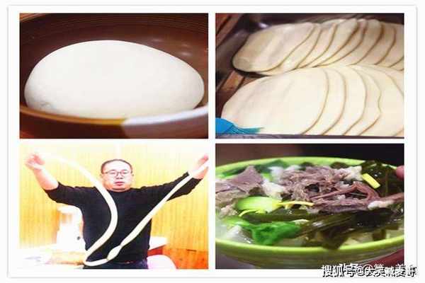 拉面:两个小时以后把饧好的面片取出来,用手捏着面片的两端,小拇指顶着面片,先从中间拉开,然后把劲向两端延伸,这样才能薄厚一致。面片拉开以后在当初制坯的压痕处撕开,就行了。