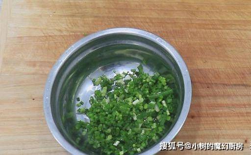 这个时候我们把小葱一把切碎,切成葱花 ,放在盆里。