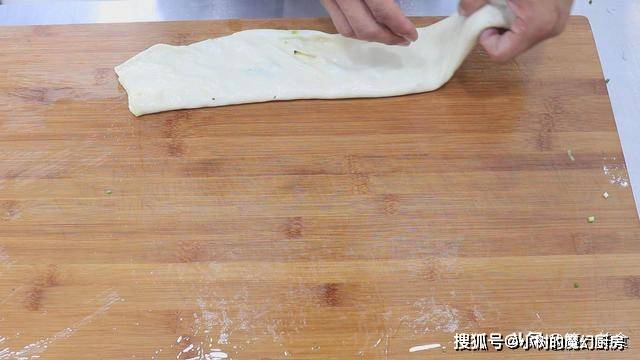 撒好以后,顺着一边折起面皮,最好折得紧一些,折成一个长方形条,注意要收口朝下。