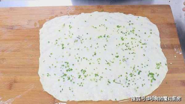先抹上一层油酥,再把准备好的小葱花也撒开。
