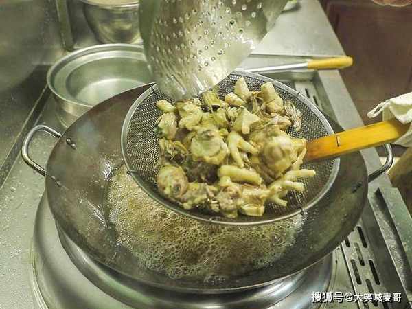锅再烧宽油,油温六成时倒入鸡块,中小火炸1-2分钟出锅控油备用。