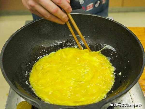 碗中打入几个鸡蛋,搅拌打散成蛋液,把鸡蛋凉油下锅炒一下,用筷子搅散,全部定型以后倒出来,这样炒出来的鸡蛋又碎又嫩。