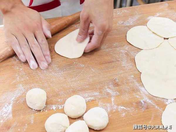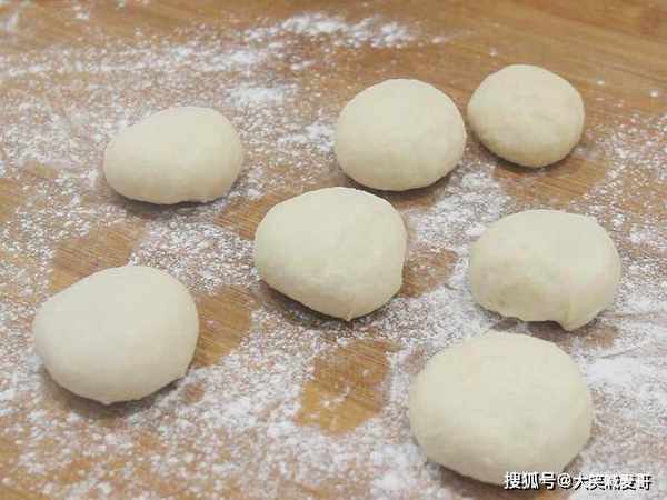 取出面团揉成长条状,再揪成一个个大小均匀的小剂子,在面剂上撒上面粉拌匀,再将面剂子擀成中间厚边上薄的面皮,面皮上放上馅料,像包包子一样收紧口,再次盖上白纱布醒发10分钟。