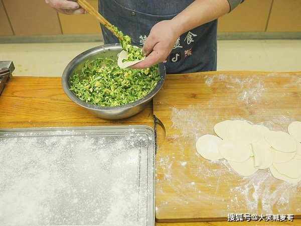 面团取出揉光滑再搓成长条,揪成大小均匀的面剂子,一个一个摁扁,擀成中间厚、两边薄的饺子皮。