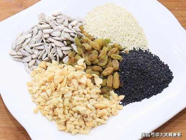 熟花生仁用刀压碎以后放在盘中,再放入葡萄干、瓜子仁、黑芝麻、白芝麻,或者自己喜欢的其他干果,加入白糖20克、面粉15克搅拌均匀以后备用。