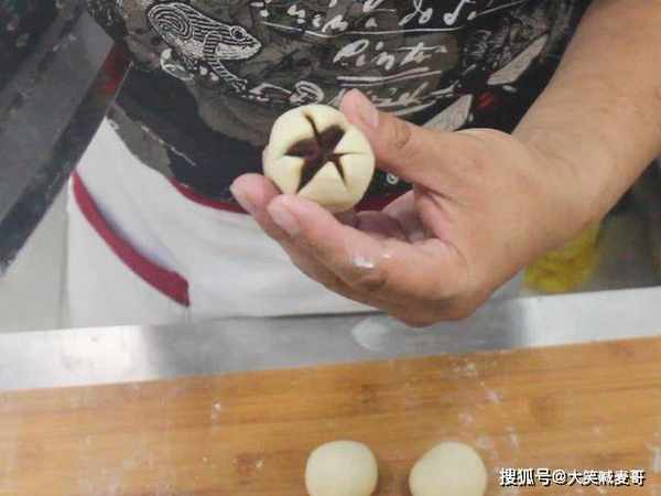 面皮擀薄一点,再包入一小块豆沙馅,放在虎口处收紧开口。把面块团成小圆球,揪掉多余的面团,然后在小圆球上切个十字,正好切到馅心的位置即可。