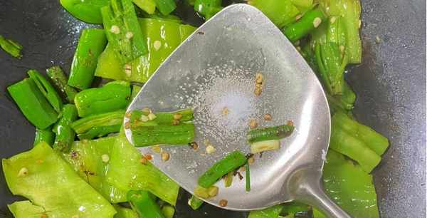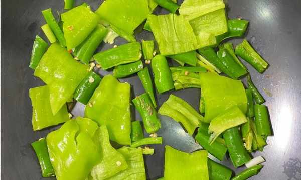 第四步:预热锅底。一开始锅底不用加油。将青椒铺在锅底,慢慢翻炒片刻,待表面呈虎皮状后加入少许油和盐,起锅翻炒。