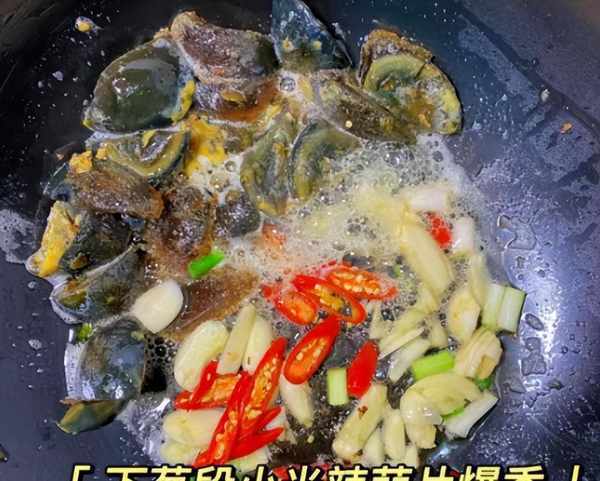 第六步:将皮蛋移开,加入少许葱、蒜瓣和辣椒小米,快速翻炒出香味,加入事先炒好的青椒丁,中小火翻炒片刻。