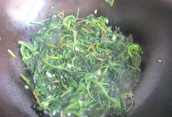 5、转高温,倒入苋菜边搅拌边炒匀。