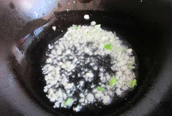 4、锅内放花生油,加入蒜末和葱花边小火边炒。