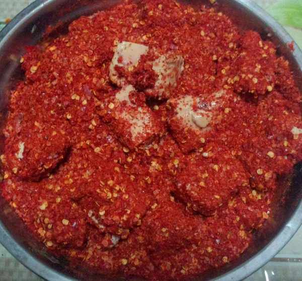 器皿淋上点白酒杀菌,同时可增香,把滚好的豆腐入内,中途可以再撒些辣椒粉直至装满
