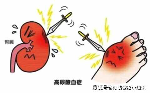 高尿酸血症患者出現結晶沉積的黃疸,可引起痛風。一般12名高個子患者有痛風。痛風50%以上發生在大脚趾,反復發作後,也可出現於其他關節,如脚、踝、手、膝等。夜間突發關節炎,夜間劇烈疼痛,關節炎標本,刀切標本,嚴重時關節畸形,异常。