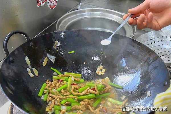 锅内烧油,充分滑锅后倒出热油,倒入凉油,热锅凉油是为了炒肉丝的时候不粘锅,放入肉丝不停地用勺子翻炒,把肉丝炒白,炒透以后,倒入葱姜蒜和干辣椒一起翻炒。