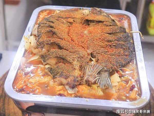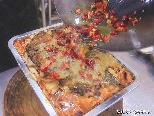 食材煮至八成熟时起锅,点燃继续加热的炉子,把配菜倒在烤盘中垫底,再放上煎好的鱼等待激油。