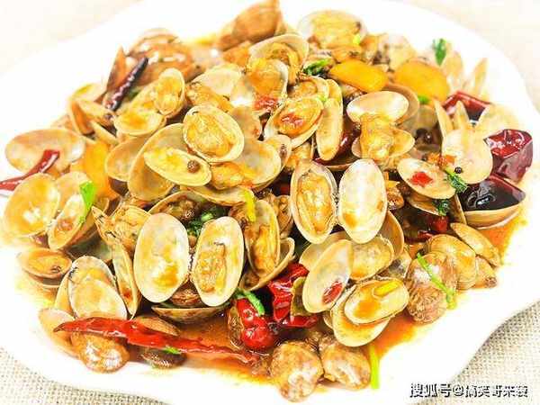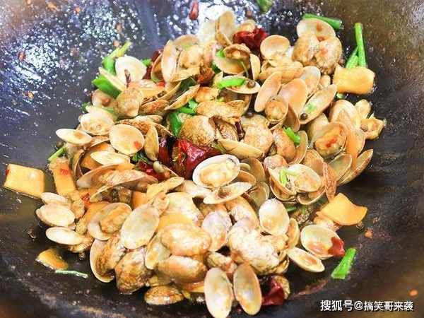 锅内烧油,油温五成热时放入姜片、花椒和辣椒,加入一勺辣椒酱、一勺香辣酱小火炒出红油和香辣味,倒入花甲后转大火爆炒一会儿,然后沿锅边淋入适量的料酒、生抽10克、少许一点清水,开始调味加入蚝油10克、胡椒粉2克、鸡精2克、食盐3克、白糖少许提鲜、继续翻炒2分钟。