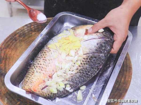 一条处理好的鲤鱼,把鱼身上的血水洗干净,在上面划上几刀;大葱破开切成葱花,生姜切成菱形片和鱼放在一起,加入适量的食盐,把鱼里里外外全部涂抹一遍,再倒入一些料酒去腥,抹匀以后腌制20分钟。