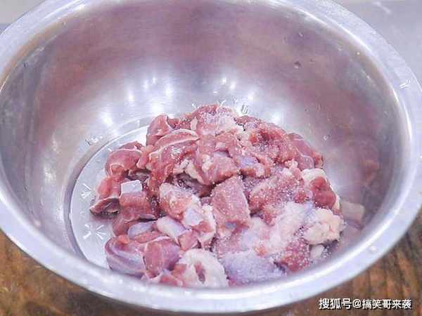 10分钟以后,把调料水过滤一下,倒入肉块中继续搅拌,让肉块吸足水分,等到肉块搅上劲以后,再淋入一点植物油拌匀备用。