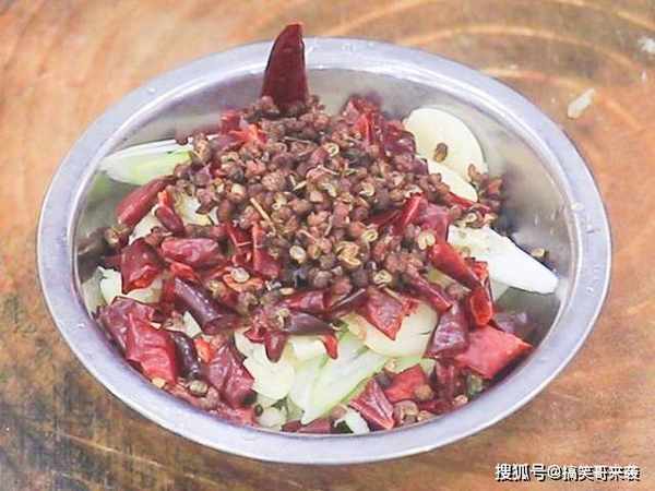 在刚刚沥出来的葱姜渣中加入适量的清水,放入一勺孜然粉、一勺辣椒面、一勺麻椒面,用筷子搅拌均匀备用。
