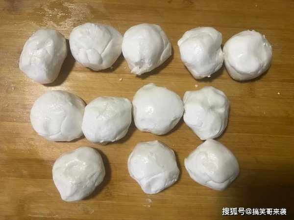 5、案板上涂抹一层食用油,能保持不粘连,把面团倒出来,按照个头大小,分成10-12个均等的面剂,分得越多,个头越小。