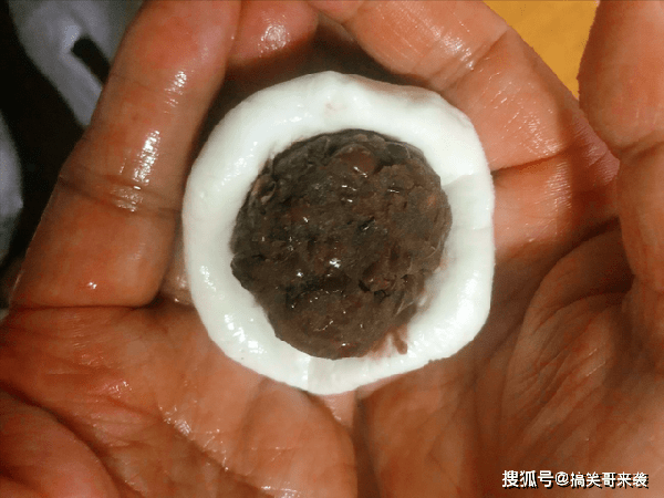6、取过来一个糯米粉,在掌心按扁,裹入适量的豆沙馅,捏紧收口,再团一团,保持不要露馅,关于馅料部分,大家可以买现成的,比较省事,豆沙、枣泥、黑芝麻都行。