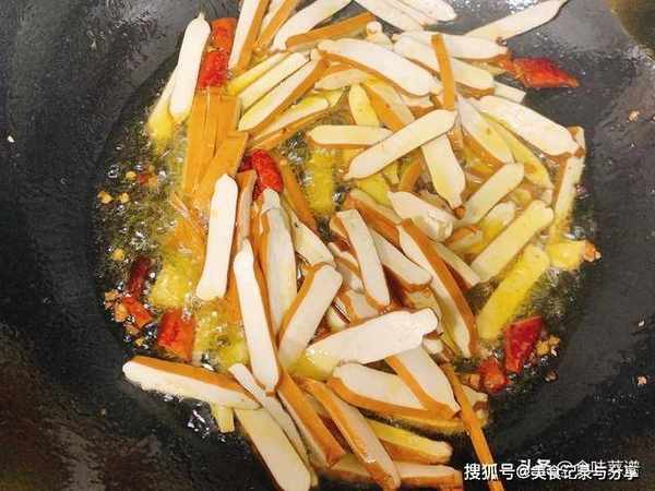 2、起锅烧油,油热放入蒜末、干辣椒爆香,不喜欢吃辣的可以不放,接着倒入香干,大火翻炒20秒钟左右。