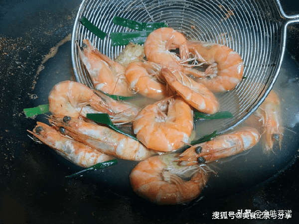 2、起锅烧水,水烧热以后,不用等完全沸腾,加入葱姜和料酒,接着放入大虾,煮熟后捞出,控干多余的水分。