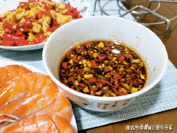 3、煮好的大虾,均匀地码放在平盘上面,再简单搭配一个料汁,碗中加入蒜末、小米椒,淋入热油激发出香味,放香醋、生抽、蚝油,边蘸边吃,鲜香美味,营养丰富。