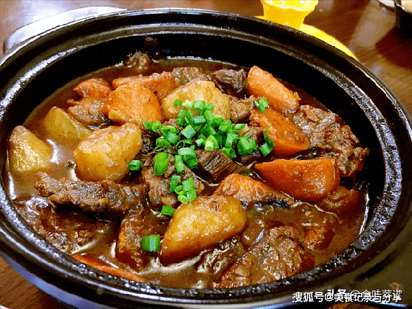 4、另外准备一个砂锅,底部铺一层洋葱,把牛肉连同汤汁一并倒进来,大火煮开转小火,慢炖一个小时,接着倒入土豆和胡萝卜,继续炖20分钟,撒小葱出锅。