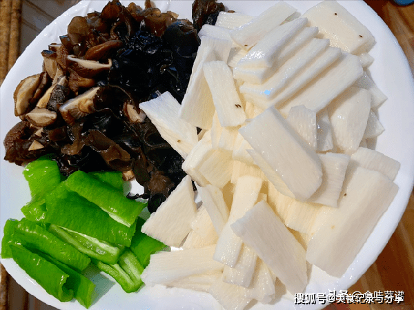 2、山药改刀切片,黑木耳提前泡软,切成小朵,再准备一些配菜,青红椒、香菇、胡萝卜之类的,自己喜欢的均可。