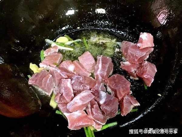 2、起锅烧油,油比平时多一些,油热后放蒜瓣和小葱,爆出香味,接着倒入牛肉,大火进行翻炒,炒至变色。