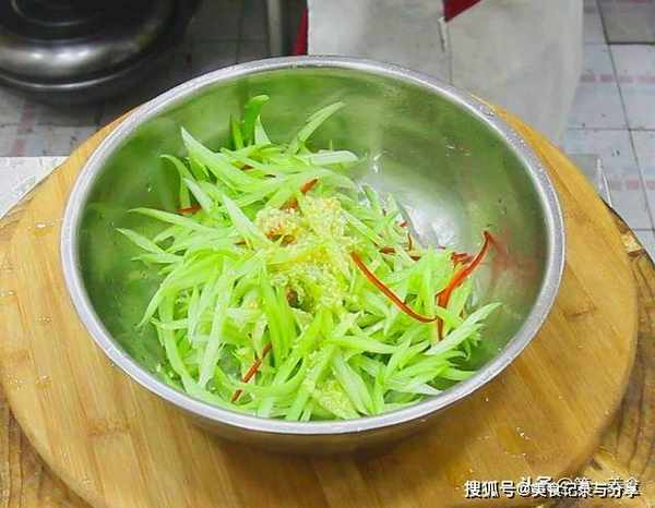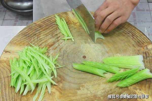 然后再把切好斜刀的芹菜段切成丝,切这个菜要有耐心,慢慢的把所有的西芹都这样切好,然后把切好的西芹放在清水中。