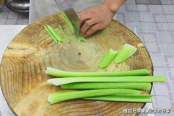 放在菜墩上,从芹菜的根部斜切下刀,而不切透,大概斜切五刀的时候再切断。