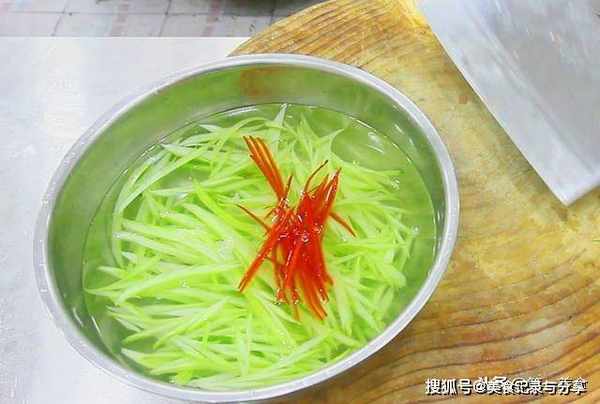 取红椒半片,把红椒片片成薄片,然后切成细丝,和芹菜一同泡在清水中。