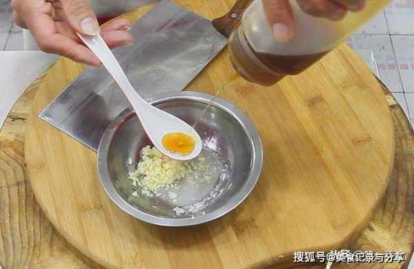 把大蒜拍扁后,切成细末,放在盘中,加入