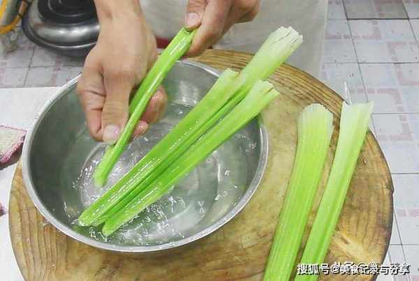 西芹一把,撕去表皮比较粗的纤维丝,过粗的纤维吃不动,还影响口感。然后放在盆中,洗掉根部藏着的泥沙。