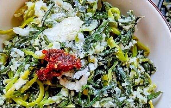 面条菜洗净,挤干水后撒上面粉抖散拌匀,然后放进蒸笼蒸5分钟。蒸好后淋上辣椒油、蒜泥,口感香糯鲜香。