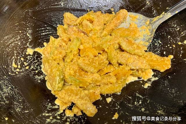 8、此时赶紧倒入南瓜,转成小火,用铲子继续翻动,让蛋黄和南瓜条充分融合,让蛋黄糊糊裹满南瓜条,如图所示,翻拌均匀,即可关火。