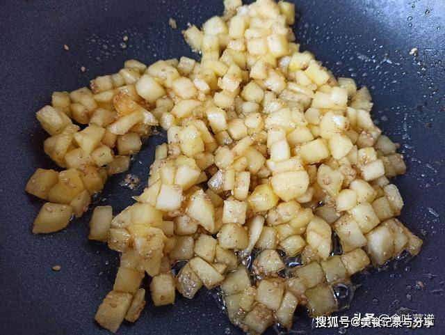 3、苹果刮去外皮,切成四方丁,锅中加入一勺白芝麻,切碎的苹果,慢慢翻炒均匀,让苹果块均匀的裹满糖汁。