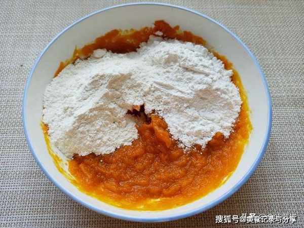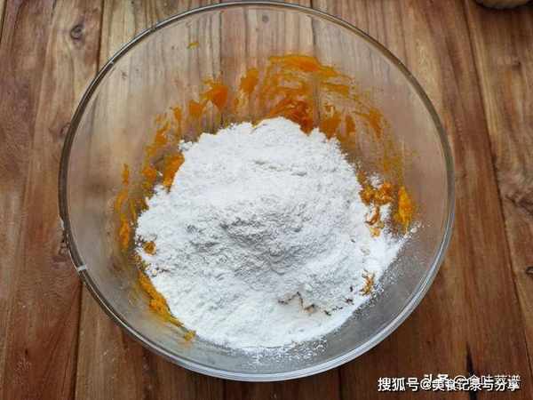 5、往南瓜泥中添加面粉,这是小饼成型的关键,边倒边搅拌,一直到没有干面粉,呈现面絮的样子,下手揉成软硬适中的面团,这个过程无需添加一滴水。