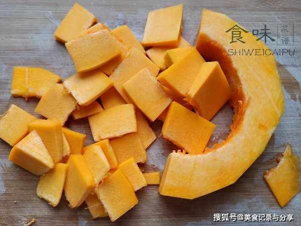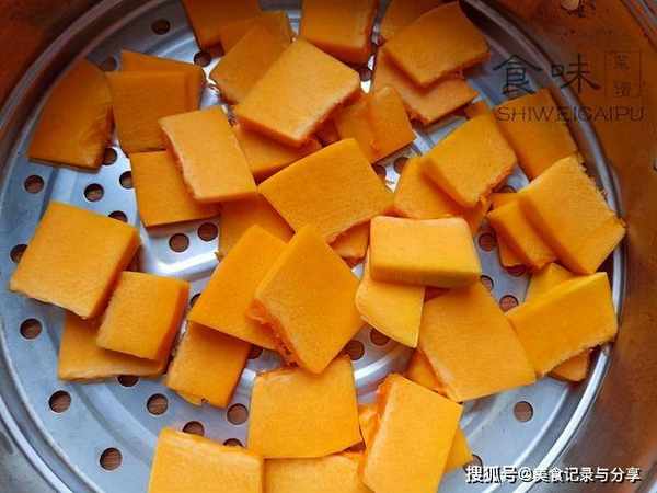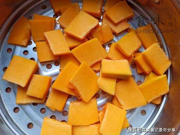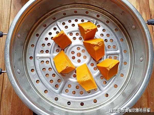 2、南瓜刨去外皮,清除籽粒,切成小块,蒸15分钟。